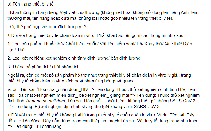 11. Khai không chuẩn về tên TBYT và model: - Tên TBYT: Khai thông tin bằng tiếng Việt viết chữ thường (không viết hoa, không sử dụng tên tiếng Anh, tên thương mại, tên hãng hoặc đưa mã, chủng loại hoặc gộp nhiều tên trang thiết bị y tế).