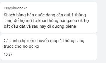 - Yêu cầu khách Việt Nam là muốn gửi gì thì gửi miễn có tờ khai thông quan xuất, gửi được hàng sang cho bên Hàn nhanh nhất và phải đáp ứng được các yêu cầu của bên Hàn Quốc.