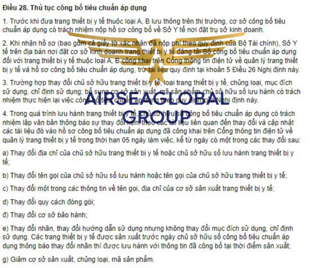 “Trong quá trình lưu hành trang thiết bị y tế, chủ sở hữu số công bố tiêu chuẩn áp dụng có trách nhiệm lập văn bản thông báo sự thay đổi kèm theo các tài liệu liên quan đến thay đổi và cập nhật các tài liệu đó vào hồ sơ công bố tiêu chuẩn áp dụng đã công khai trên Cổng thông tin điện tử về quản lý trang thiết bị y tế trong thời hạn 05 ngày làm việc, kể từ ngày có một trong các thay đổi sau: