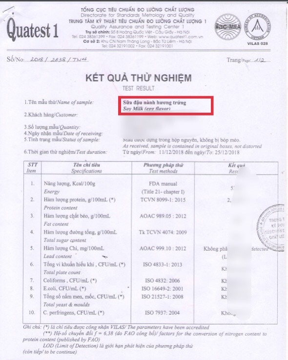 - Phiếu kết quả kiểm nghiệm sản phẩm; (đầy đủ chỉ tiêu theo QCVN và được kiểm nghiệm tại trung tâm được nhà nước công nhận/chỉ định)